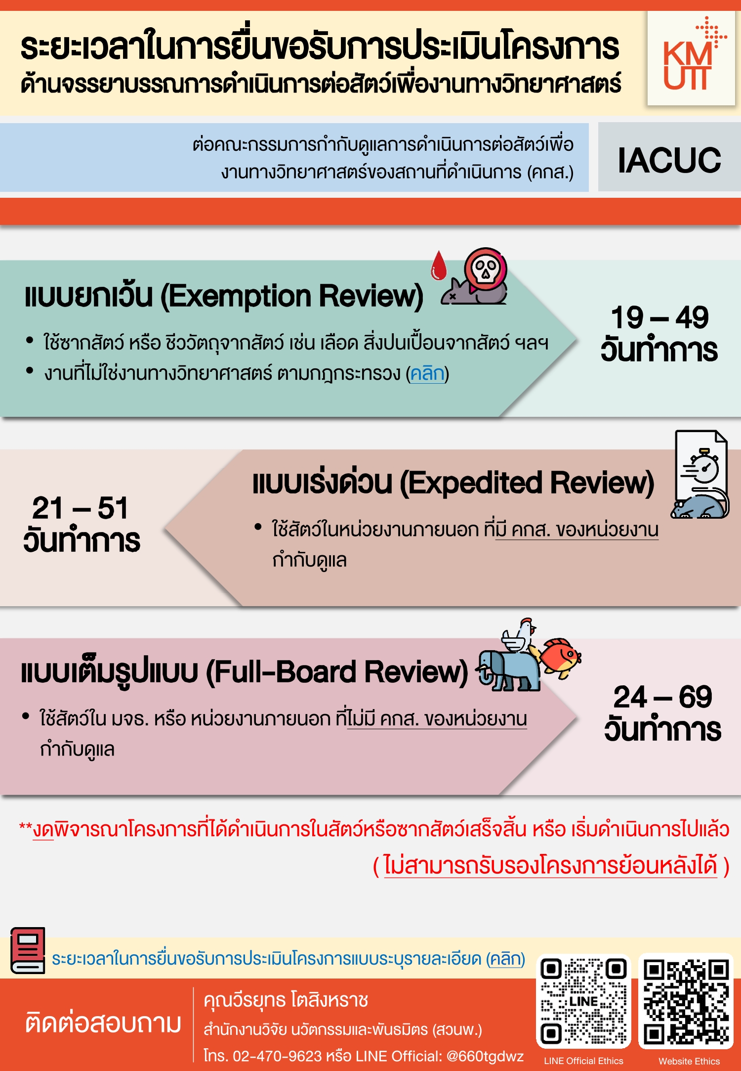 คณะกรรมการกำกับดูแลการดำเนินการต่อสัตว์เพื่องานทางวิทยาศาสตร์ของสถานที่ดำเนินการ (คกส.) มหาวิทยาลัยเทคโนโลยีพระจอมเกล้าธนบุรี (มจธ.) ให้การพิจารณารับรองด้านจรรยาบรรณการดำเนินการต่อสัตว์เพื่องานทางวิทยาศาสตร์สำหรับโครงการวิจัย การเรียนการสอนที่ดำเนินการต่อสัตว์หรือซากสัตว์หรือชีววัตถุจากสัตว์ของ อาจารย์/นักวิจัย/นักศึกษา มจธ.